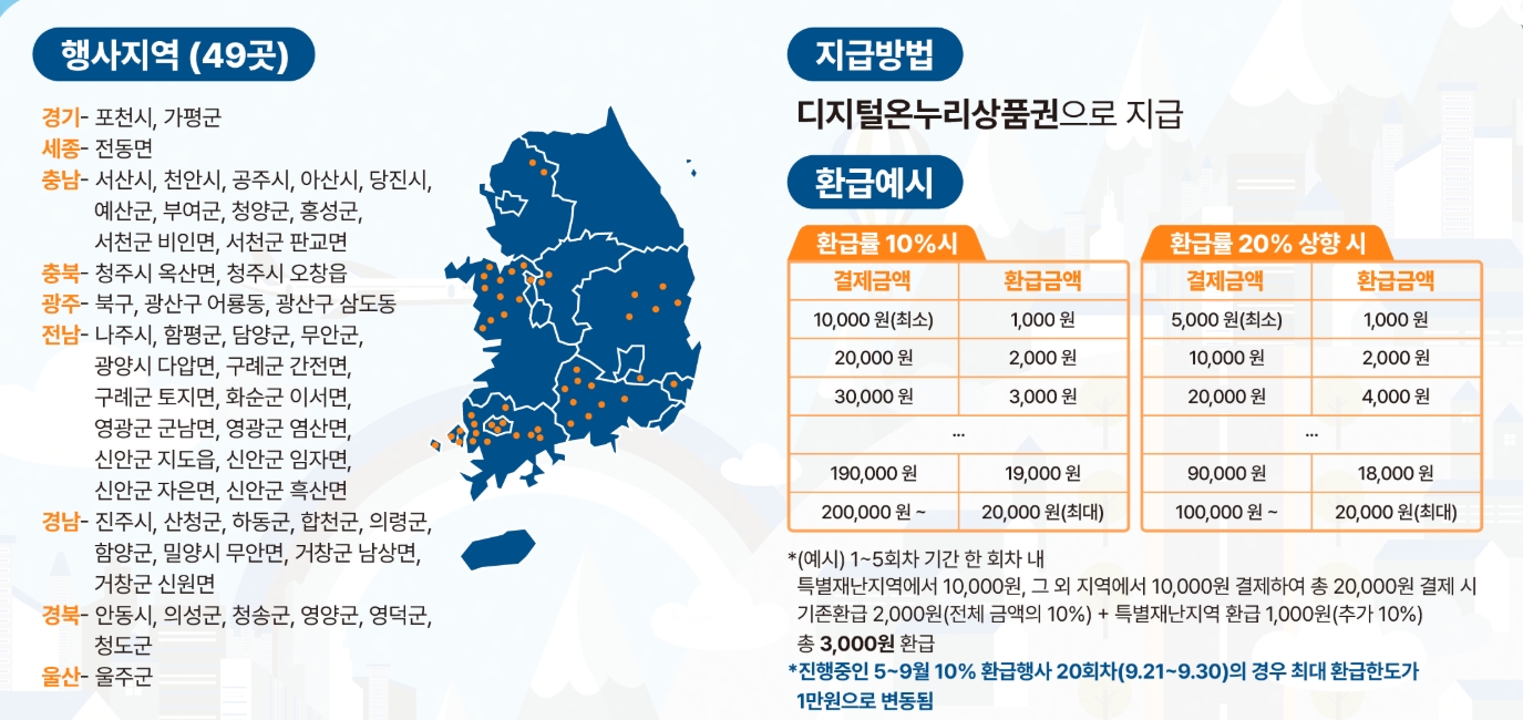 - 기존 10% 환급행사에 더해 특별재난지역 추가 10% 환급이 적용됩니다.