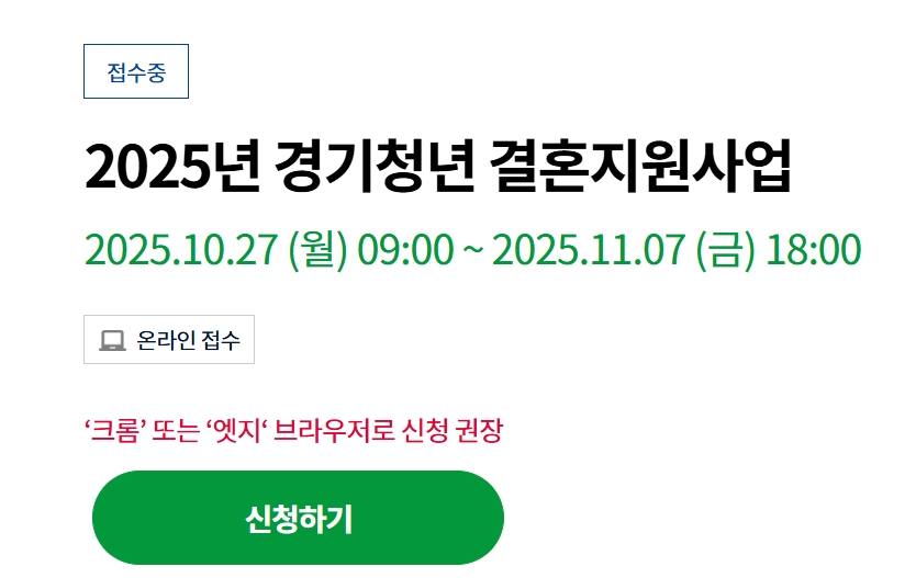 경기도가 2025년 경기청년 결혼지원사업 2차 모집을 시작합니다. 이번 모집을 통해 경기도 내 청년 신혼부부 1,540쌍에게 100만 원의 결혼지원금이 지급될 예정입니다.