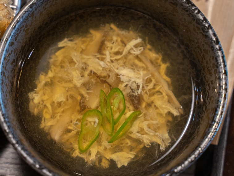 정식 메뉴에는 골드퀸 품종으로 지은 밥, 직접 우려낸 장국, 양배추 샐러드, 그리고 브라운소스와 타르타르소스가 함께 제공된다.