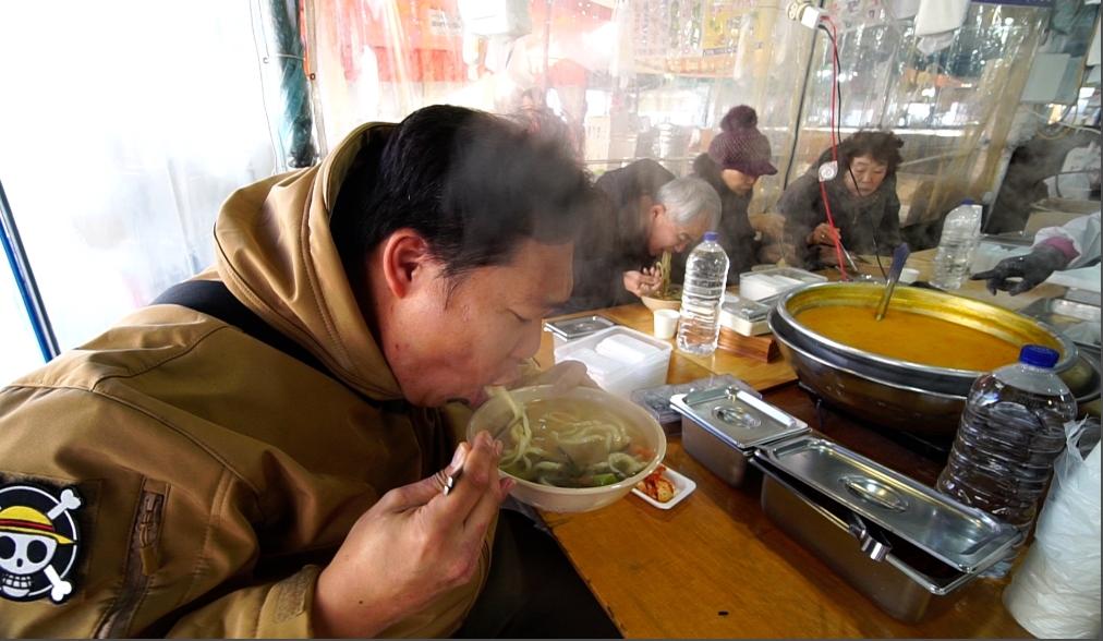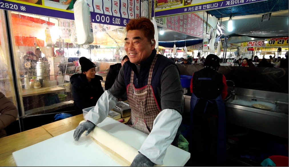 시장 안쪽으로 조금 더 들어가면 늘 붐비는 칼국숫집이 나온다. 유영진 씨는 전동 퀵보드를 타고 시장 곳곳을 오가며 국수를 배달한다. 바쁜 상황 속에서도 면을 밀 때만큼은 여유를 잃지 않는다.